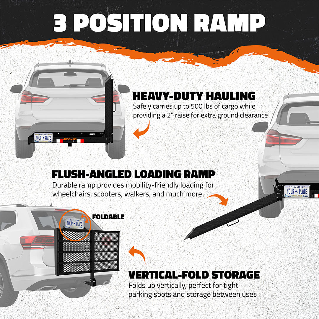 Conveniently load wheelchairs, mobility scooters, lawn mowers, snow blowers, appliances and more with the Mockins Wheelchair Hitch Carrier. Load up with confidence and control with the Mockins Scooter Hitch Carrier with Ramp.