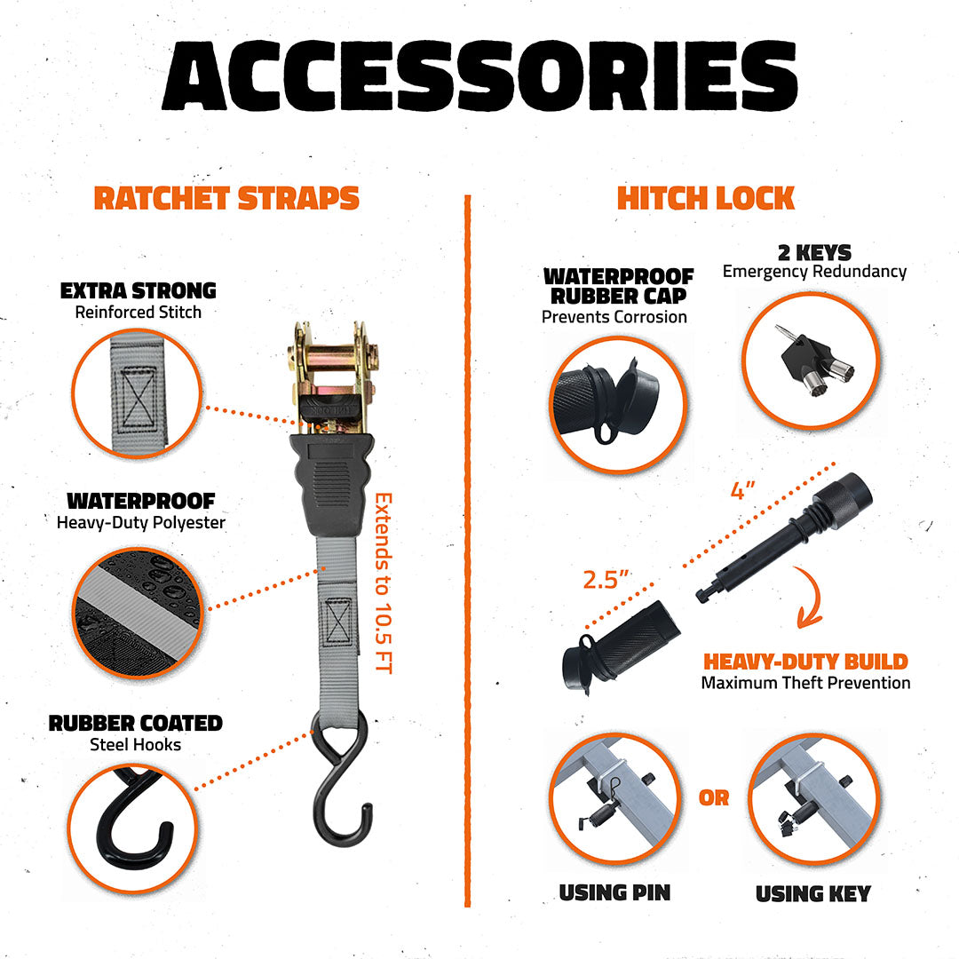 - Buckle and ratchet straps for securing your belongings on the hitch carrier
