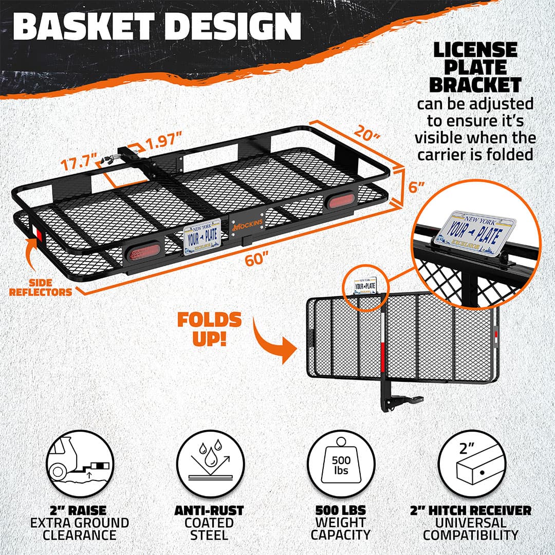 The Mockins Hitch Cargo Rack transports up to 500 lbs. of cargo, instantly increasing your available luggage capacity and freeing up your vehicle's interior space. This sturdy hitch rack is forged from heavy-duty rust-proof steel, making it a lasting solution to all your hauling needs.
