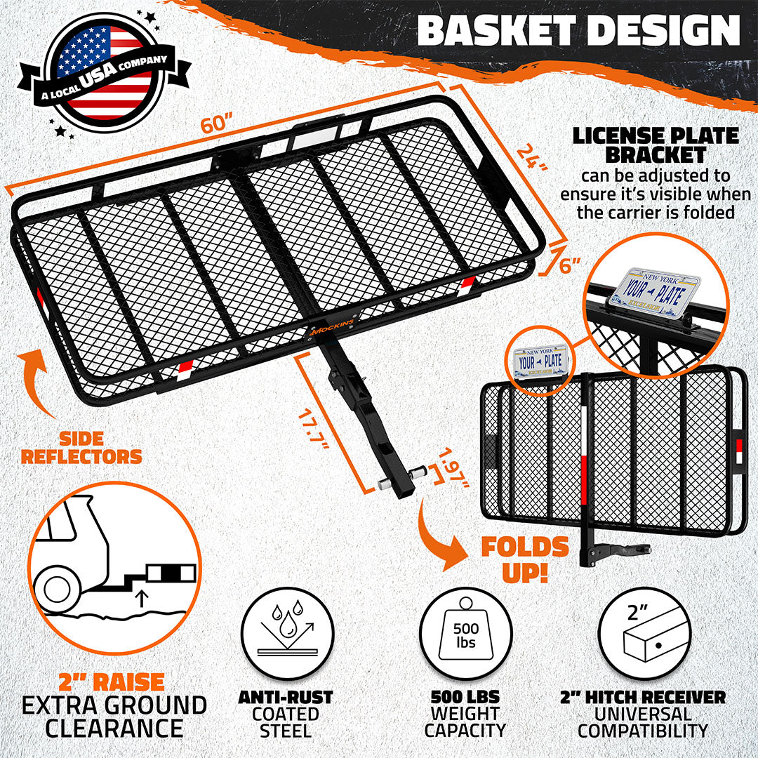 • Hitch basket folds up and comes with a convenient license plate holder.