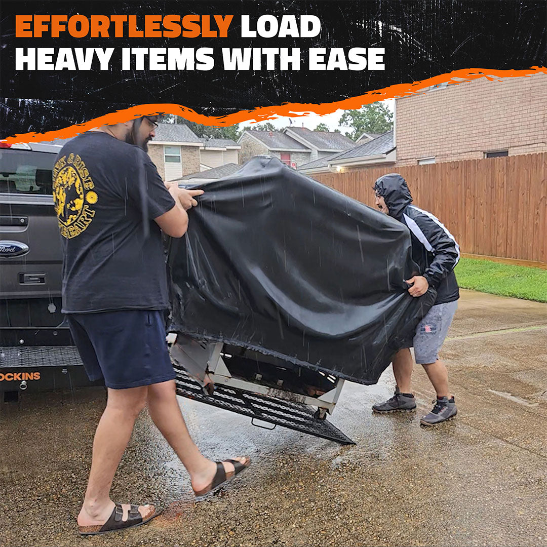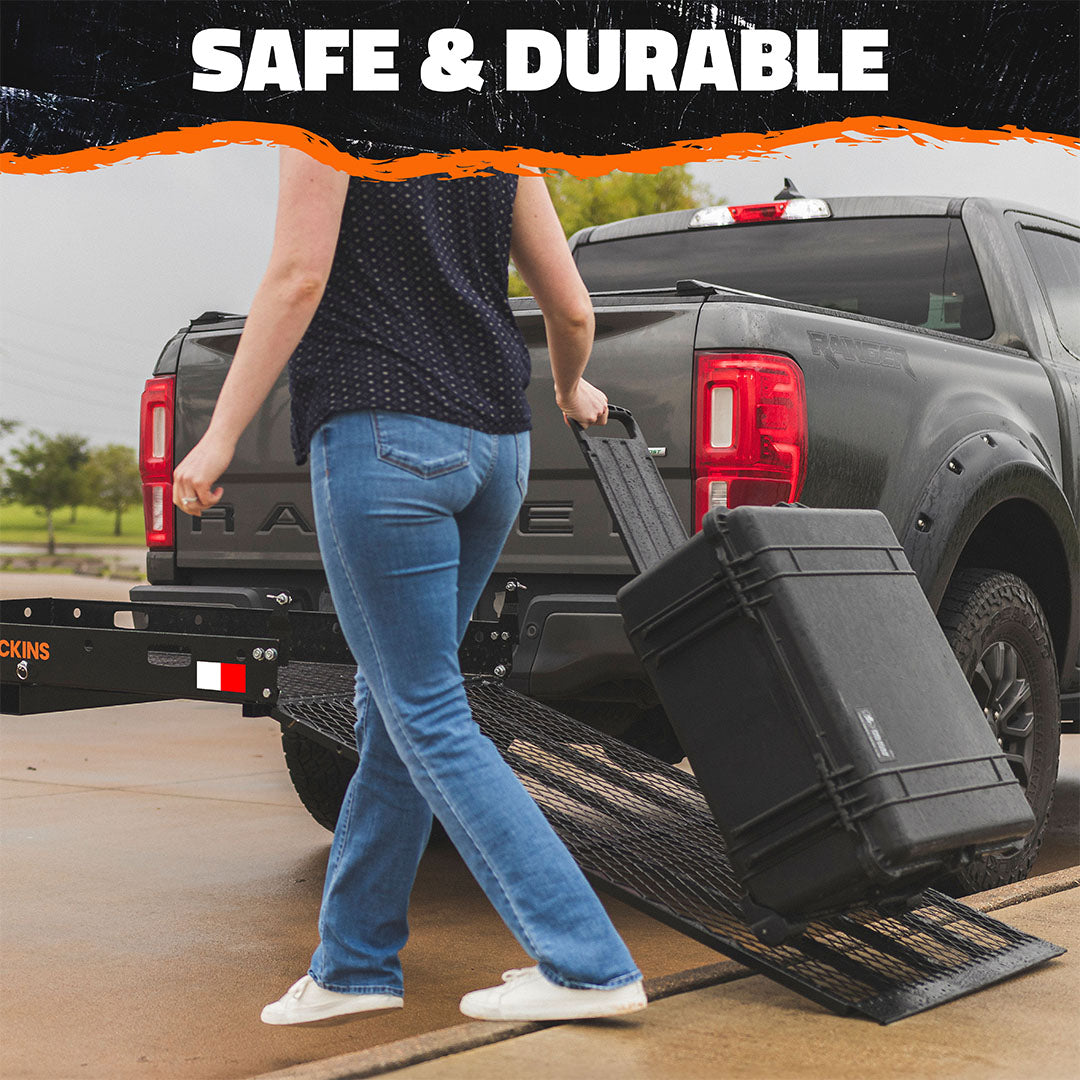 Haul heavy with unparalleled convenience on the Mockins 60" x 30" x 5" Extra Large Hitch Cargo Carrier Scooter Trailer. Designed to support bulky and irregular payloads, our wheelchair carrier for car hitch features a 500 lbs. weight capacity and easy-to-use folding ramp with rubber-lined edges.