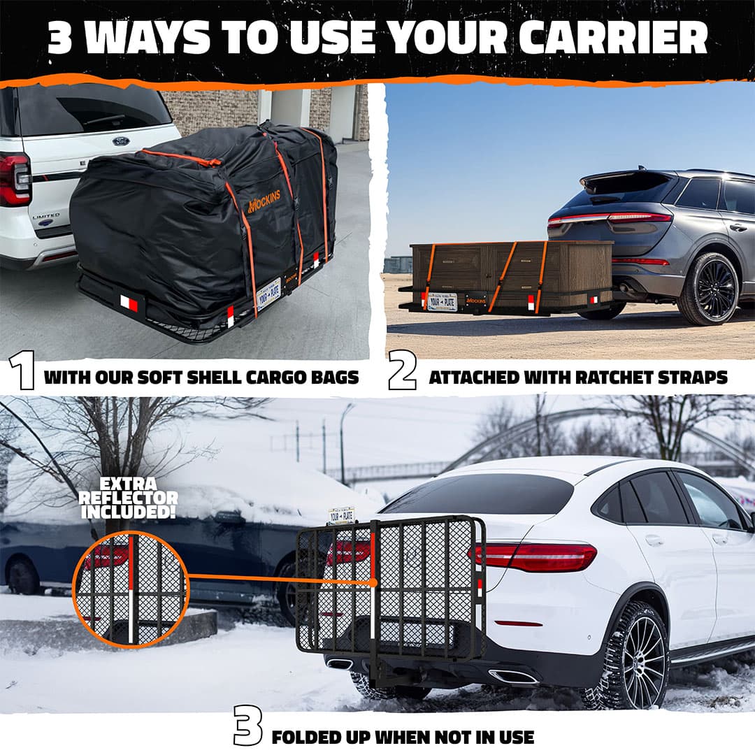 Experience hassle-free hauling with the Mockins Deluxe Cargo Carrier bundle. Our XL Trailer Hitch Cargo Carrier is the ideal solution for transporting large and irregular cargo. If you’re looking for a reliable heavy-duty hitch carrier, the Mockins Hitch Rack Cargo Carrier Set has you covered!