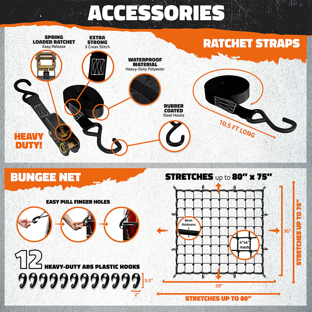 Find some flexibility in the way you pack with the Rooftop Cargo Basket Bundle. With two adjustable lengths (43" and 64"), this rooftop rack accommodates and secures cargo of all shapes and sizes. No more worrying about picking up too many souvenirs!
