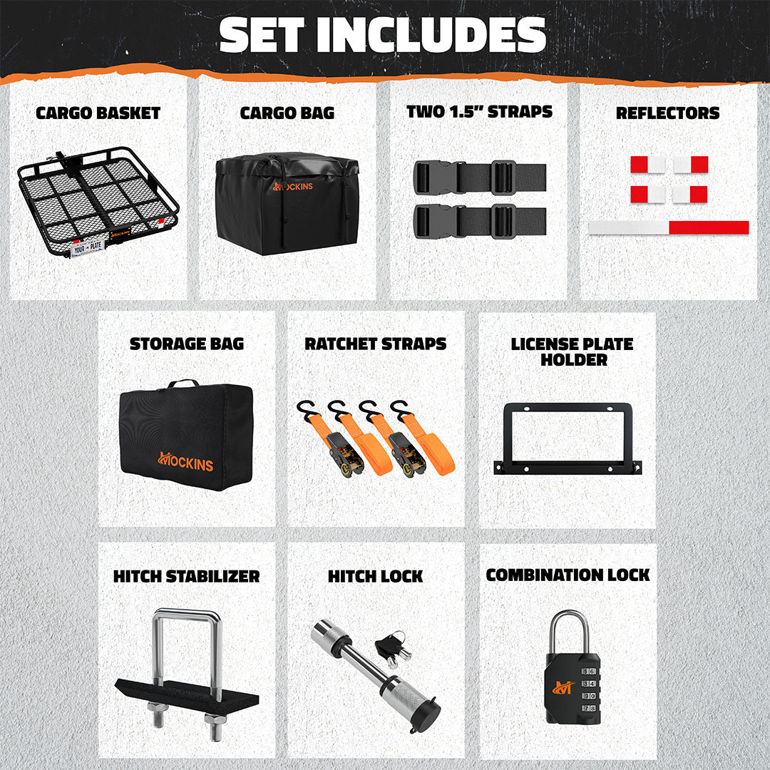 Pack smarter with the Mockins Square Trailer Hitch Cargo Carrier Set, capable of supporting up to 500 lbs. of gear and personal items. Transport generators, coolers, suitcases, cargo boxes and more!