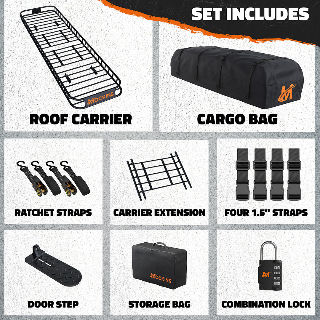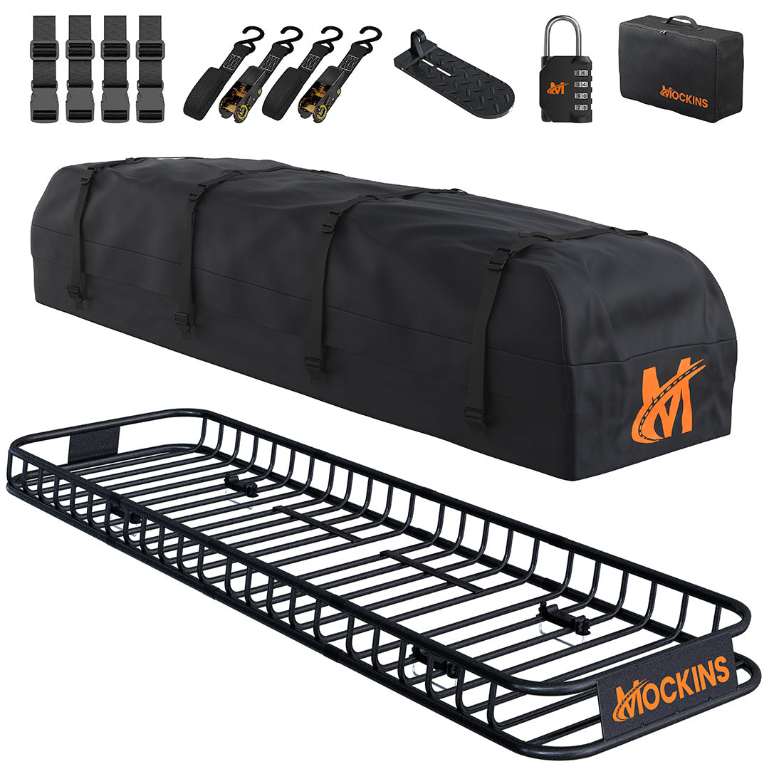 Pack heavy and save space with the Mockins Narrow Roof Rack Basket Set, featuring a rust-resistant steel roof basket with adjustable lengths of 50", 68" and 85". Support up to 250 lbs. of cargo of various shapes and sizes on any vehicle with cross bars without the hassle. Take your packing up a notch with the Mockins Skinny Roof Top Cargo Carrier!