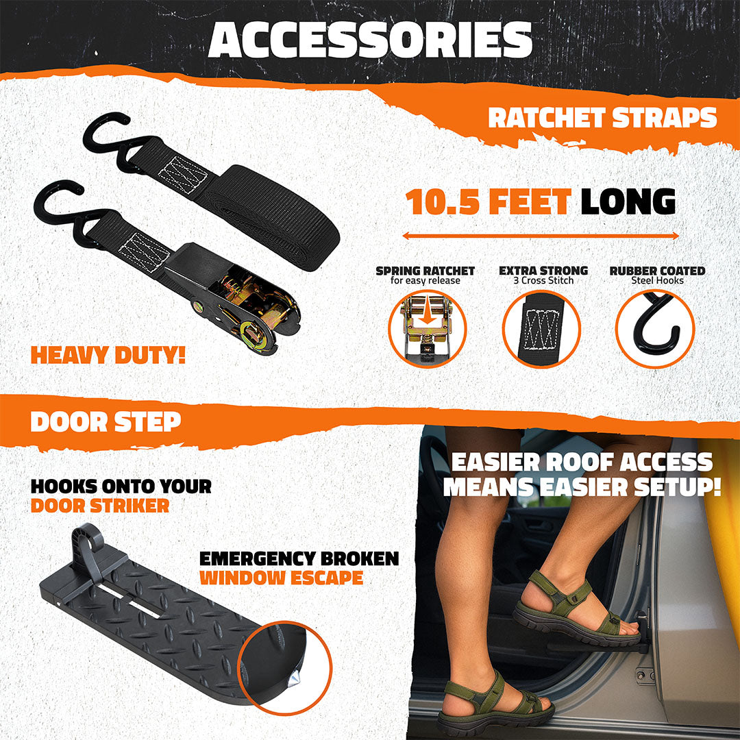 - 4 buckle straps and 2 ratchet straps firmly fasten down roof cargo