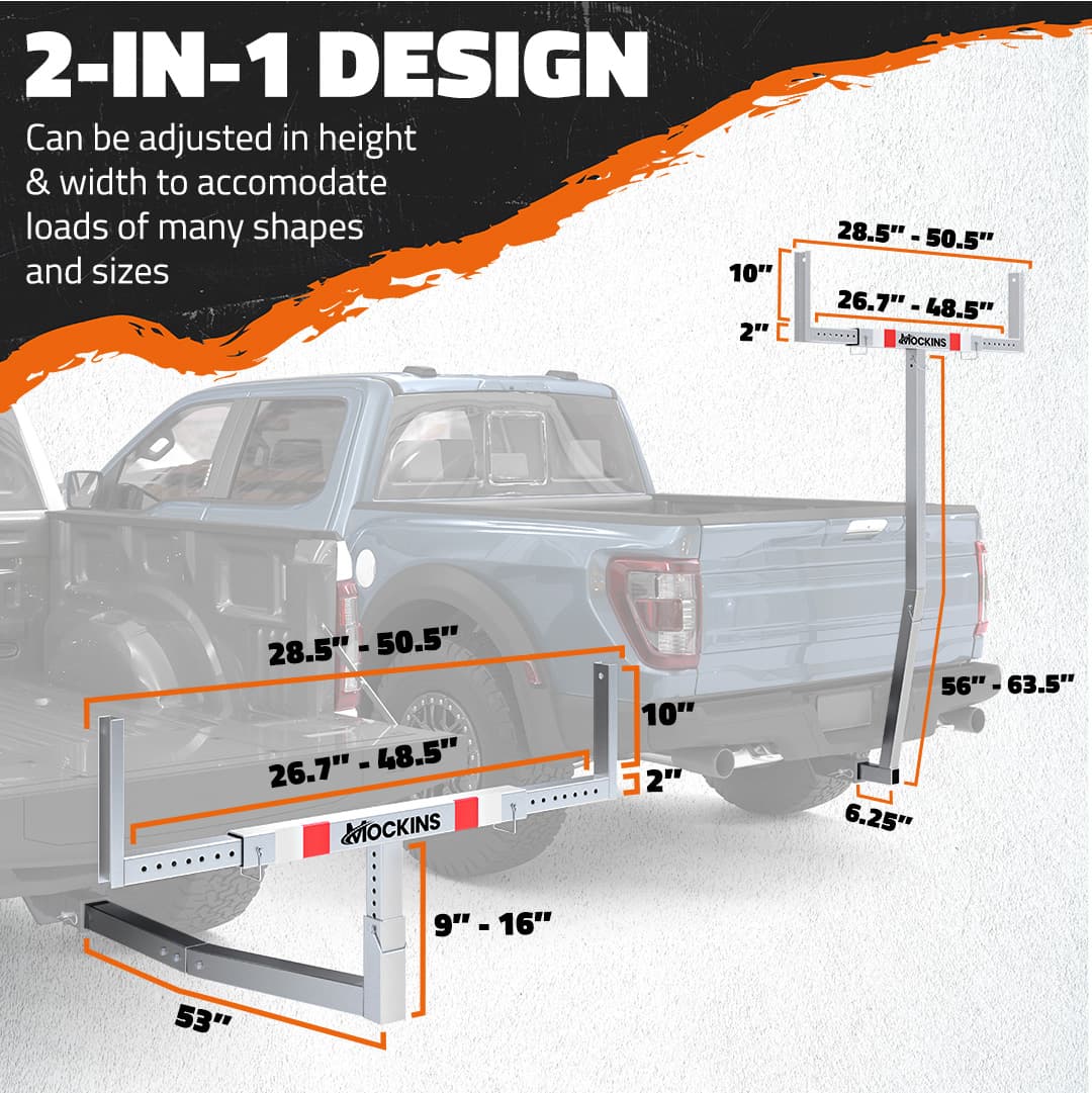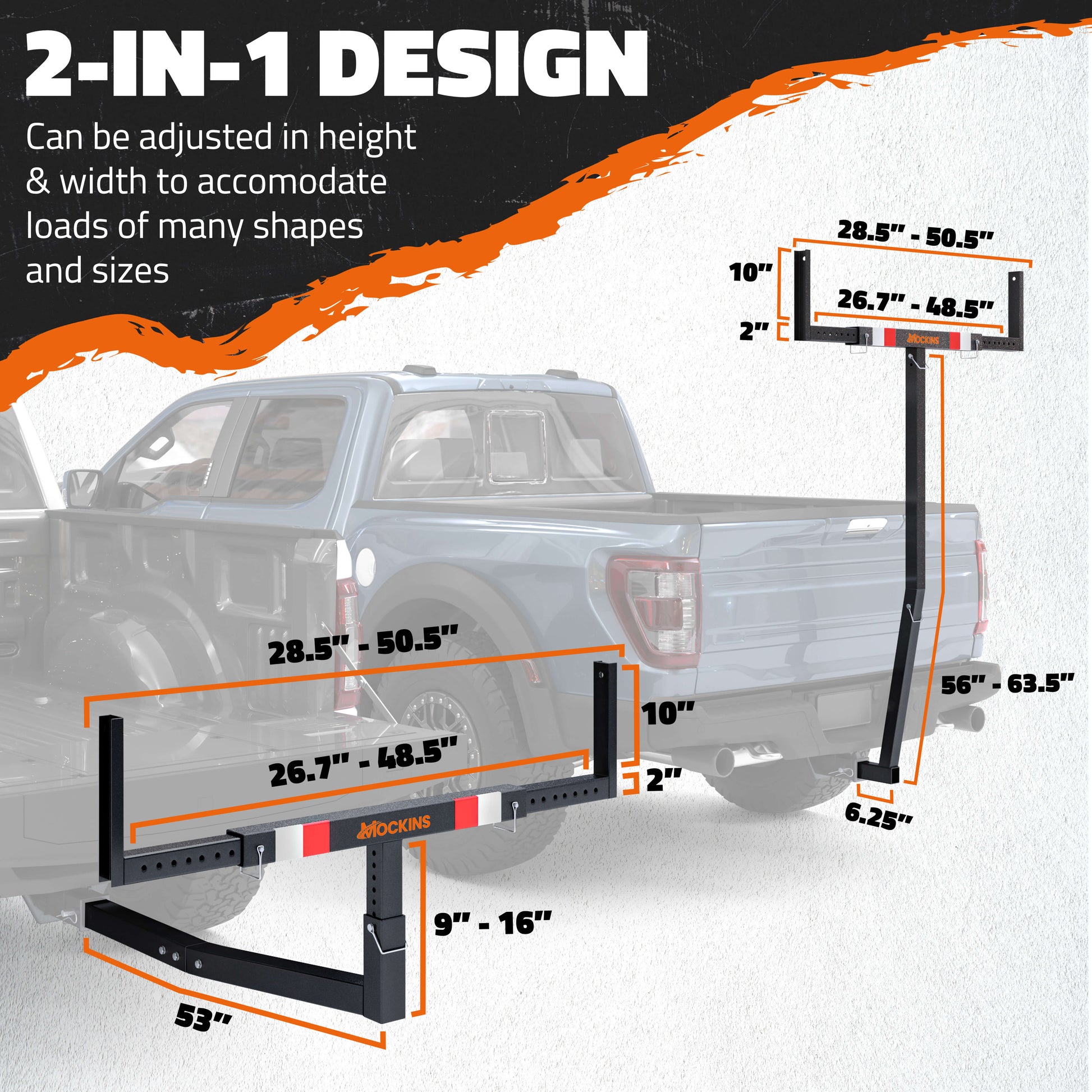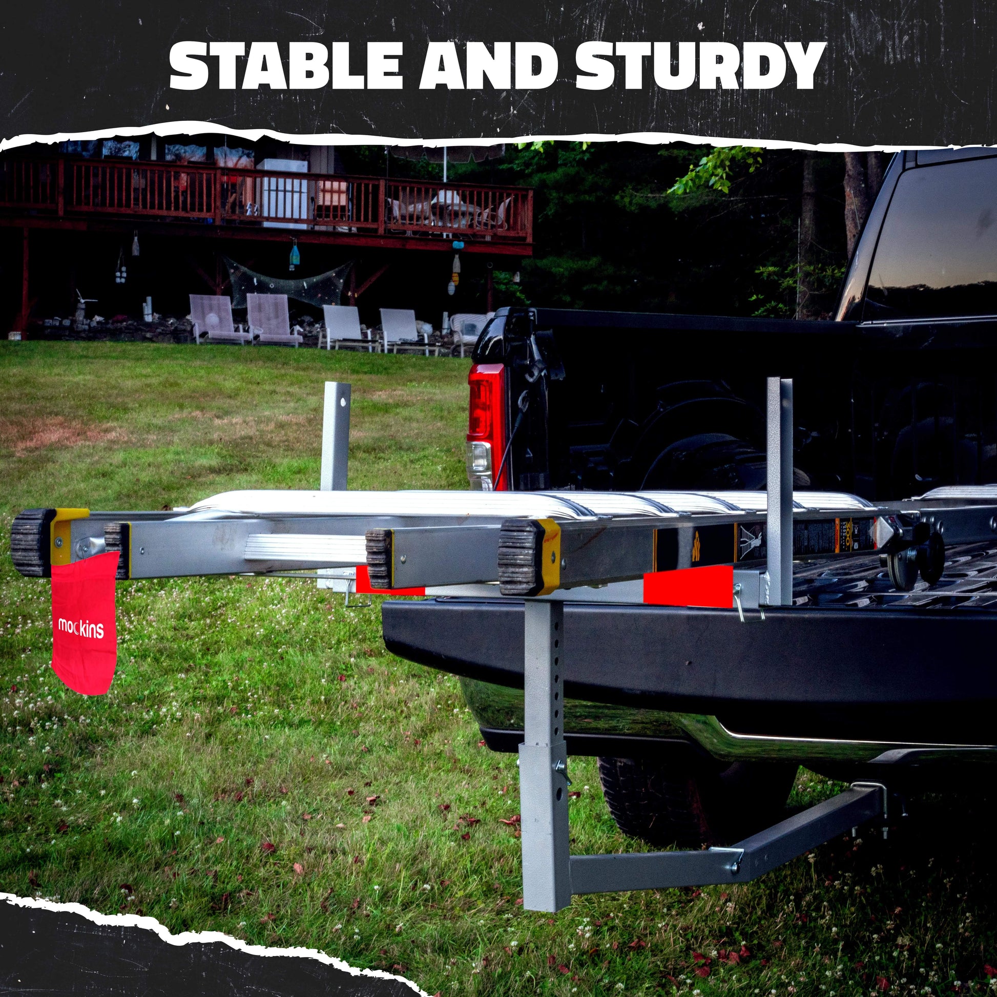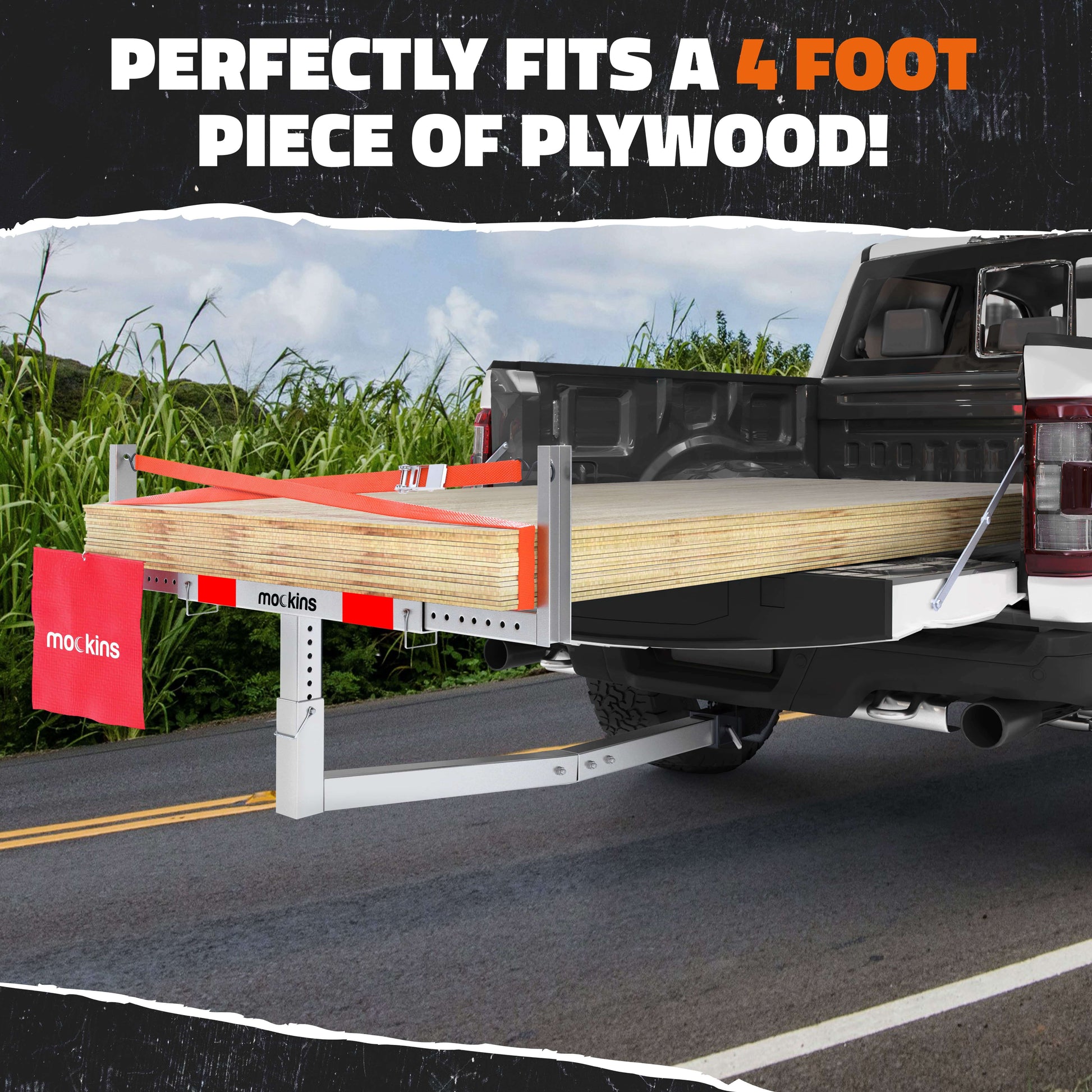 Give your truck more stability with the Mockins 750 lbs. Capacity Two-in-One Pickup Truck Bed Extender with Flag, Stabilizer and Ratchet Straps. This tailgate extender allows you to quickly load up your items and hit the road!