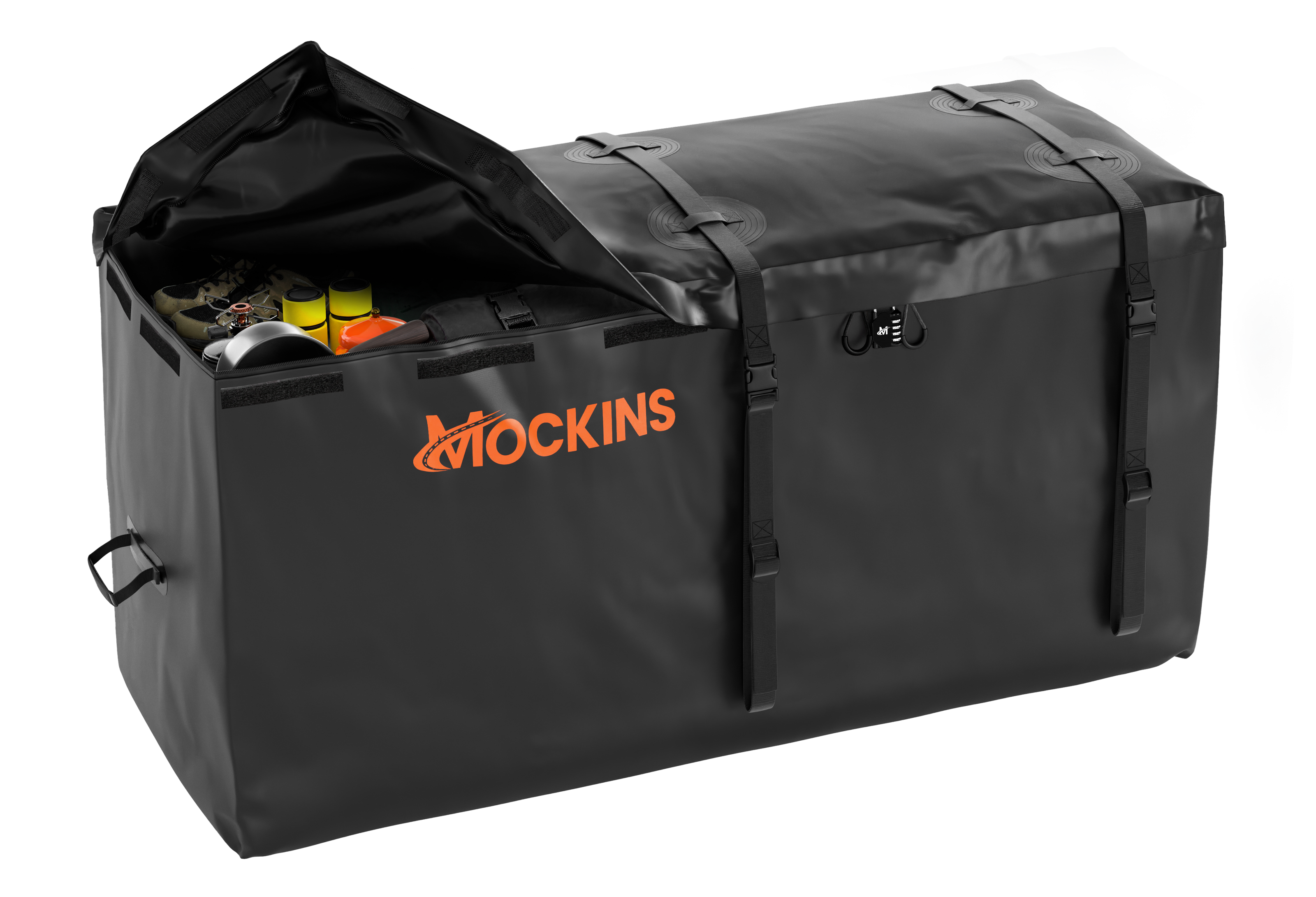 With the Mockins Hitch Rack Cargo Carrier Set, you’ll have everything you need for hassle-free hauling. It comes with a sturdy weatherproof 25 cubic foot car carrier bag, a license plate holder, ratchet straps, buckle straps, a bungee net, a bag lock, a hitch lock and a hitch stabilizer for security and stability.